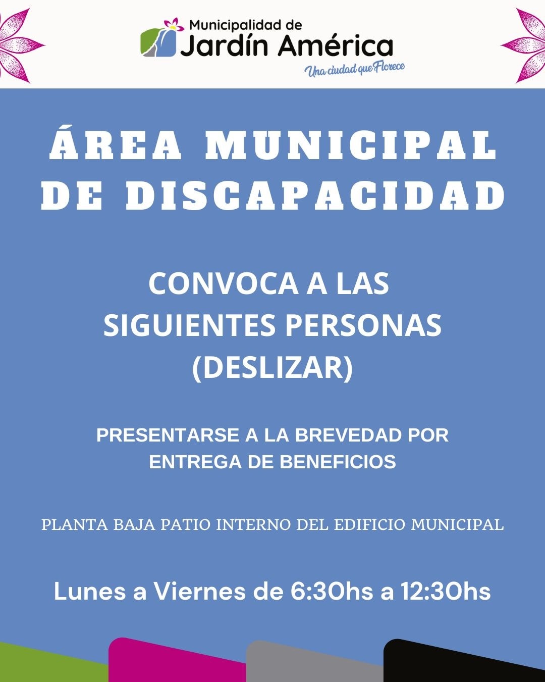 El Área de Discapacidad convoca a las personas mencionadas a acercarse a la brevedad para la entrega de insumos