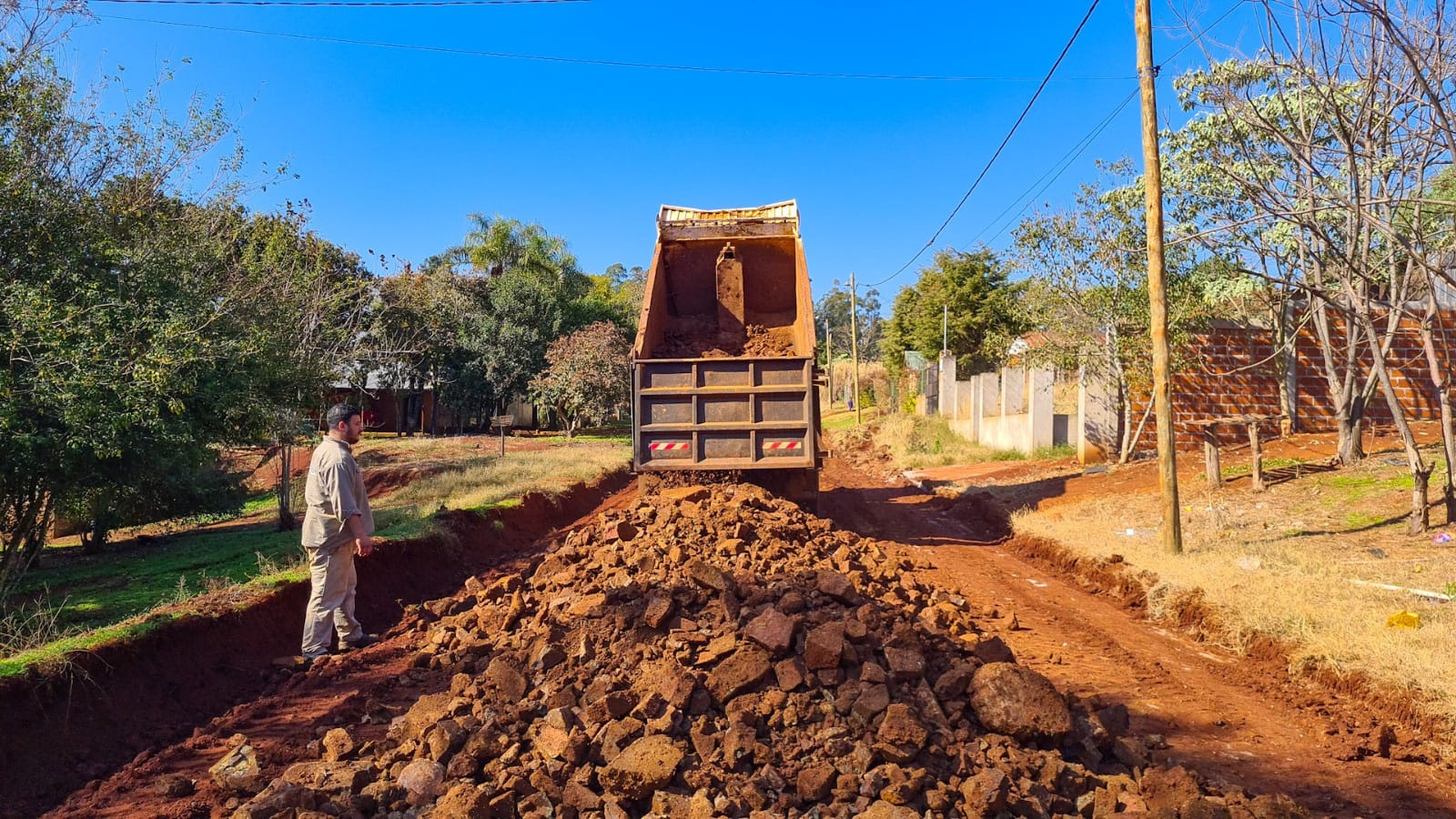 Esta vez, el equipo realizó tareas de perfilado y entoscado en el barrio Lomas de Jardín, mejorando calles y accesos para una circulación más segura y cómoda